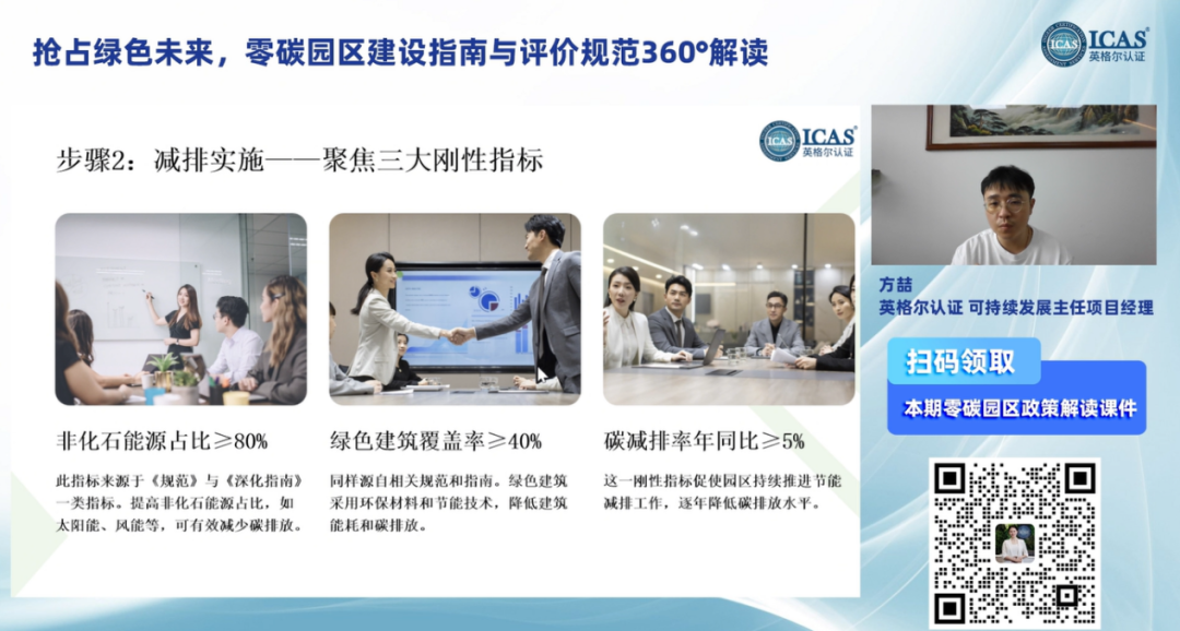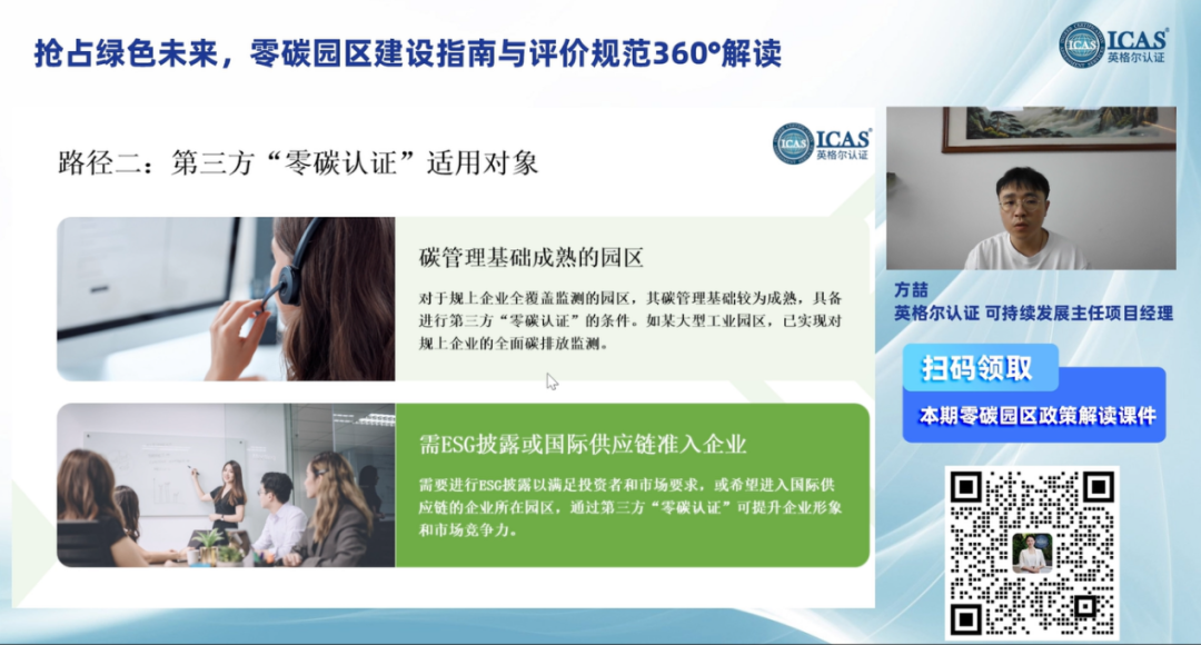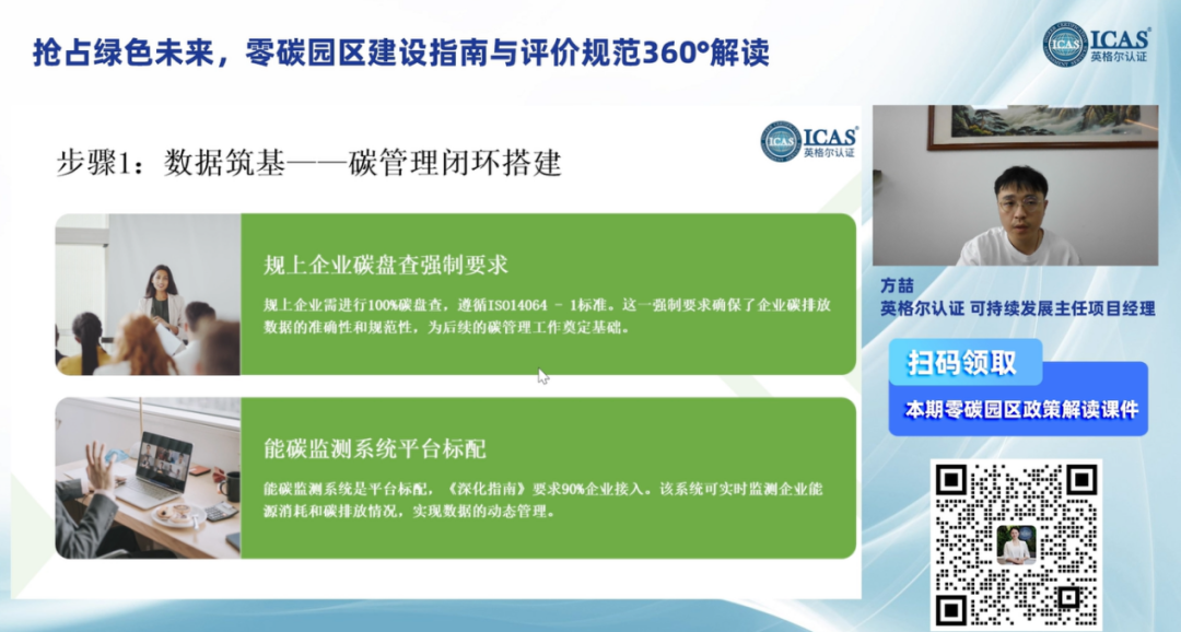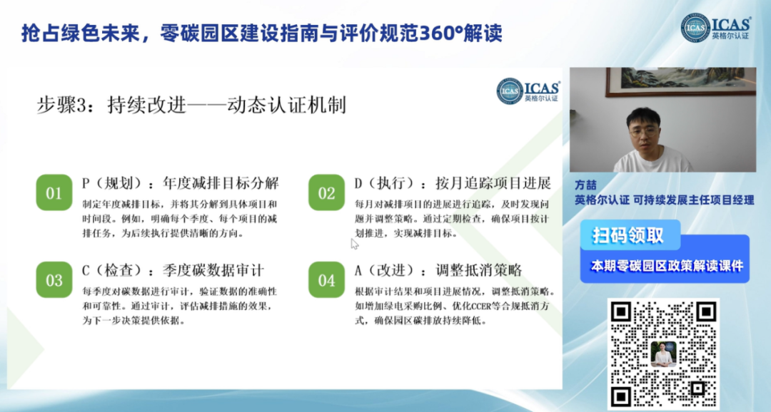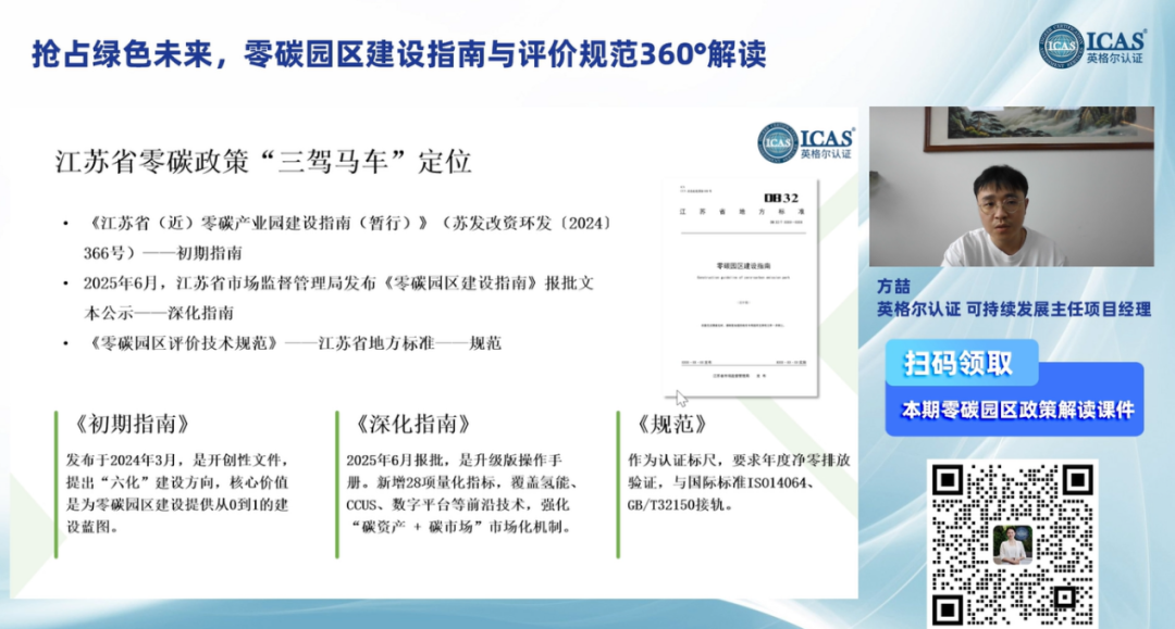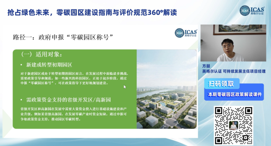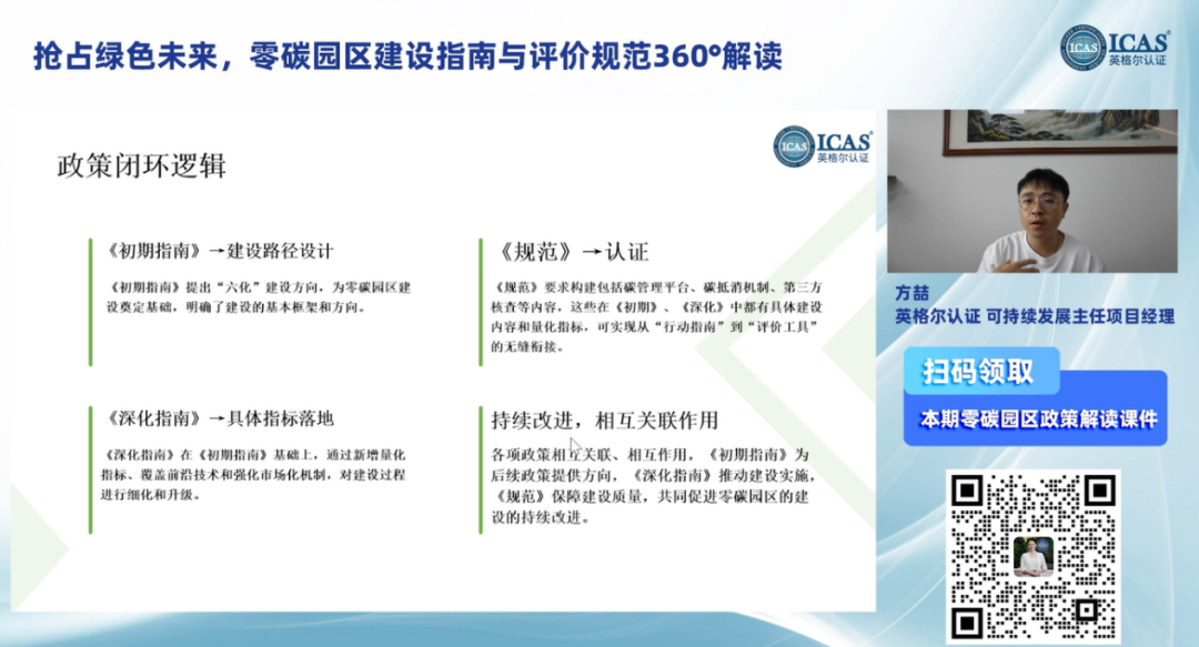 在此背景下,ICAS英格尔认证在近日带来了一场主题为《抢占绿色未来:零碳园区建设指南与评价规范360度解读》的专题直播分享,本次分享围绕政策背景、实施路径、落地关键及针对性建议展开,为零碳园区建设提供了清晰框架。(点击图片免费下载演讲课件)