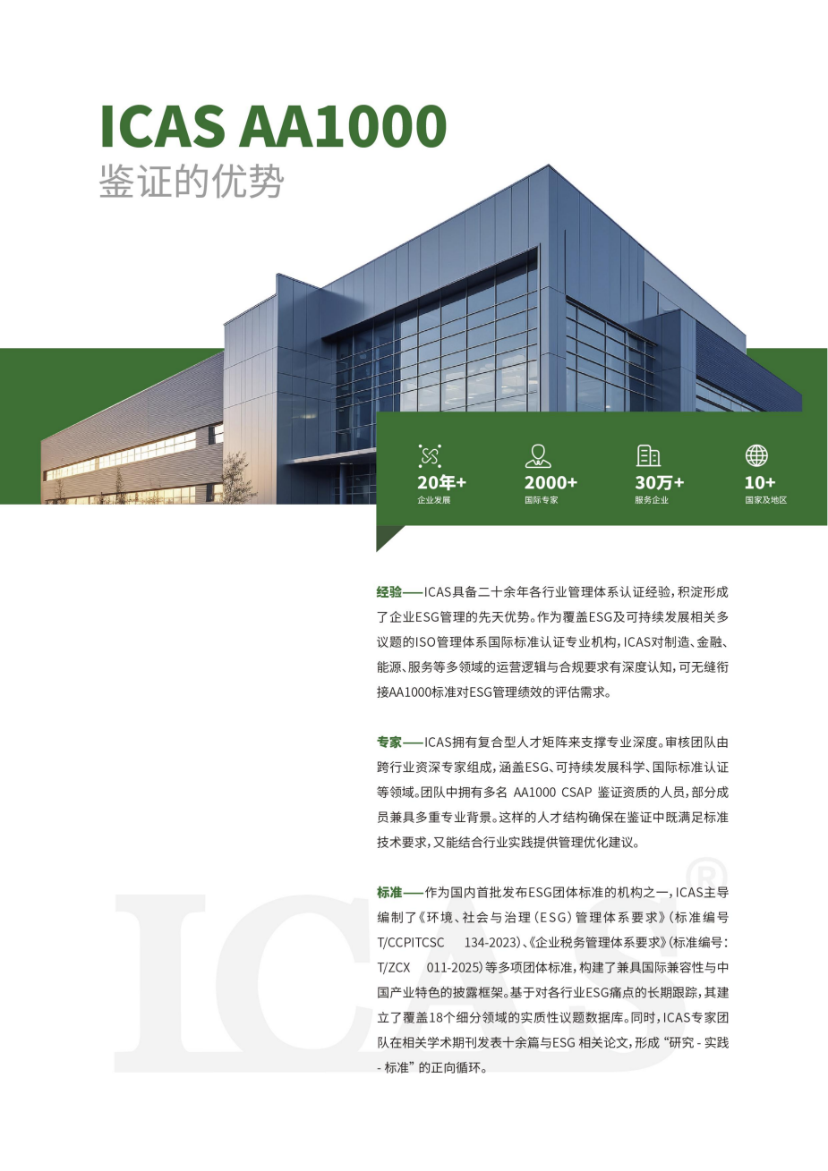 ICAS英格尔认证的专家团队中拥有多名AA1000 CSAP持证人员,具备跨行业审核的丰富经验。此外,ICAS主导编制了《环境、社会与治理(ESG)管理体系 要求》等多项ESG相关团体标准,这些标准既与国际框架紧密契合,又深刻贴合国内的产业实际,团队专家还在权威学术期刊上发表了十余篇ESG相关论文,持续推动“研究—实践—标准”深度融合与良性循环,凭借深厚的专业积累,ICAS能够帮助企业将鉴证过程转化为管理升级的重要契机,真正实现从披露合规迈向战略赋能的价值跨越。