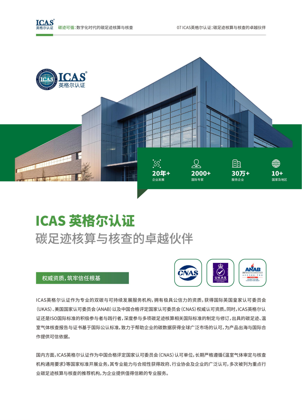 ICAS英格尔认证作为专业的双碳与可持续发展服务机构,拥有极具公信力的资质,获得国际英国皇家认可委员会(UKAS)、美国国家认可委员会(ANAB)以及中国合格评定国家认可委员会(CNAS)权威认可资质。同时,ICAS英格尔认证还是ISO国际标准的积极参与者与践行者,深度参与多项碳足迹核算相关国际标准的制定与修订,出具的碳足迹、温室气体核查报告与证书基于国际公认标准,致力于帮助企业的碳数据获得全球广泛市场的认可,为产品出海与国际合作提供可信依据。
