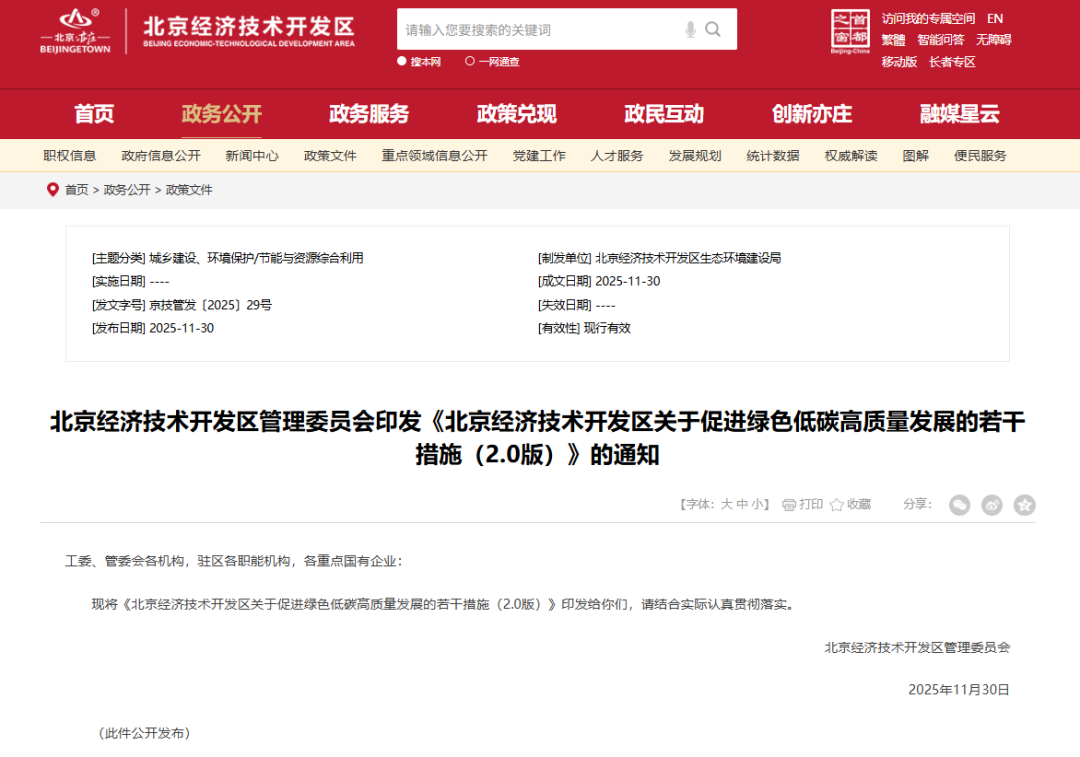 近日,北京经济技术开发区正式发布《促进绿色低碳高质量发展的若干措施(2.0版)》(以下简称《措施(2.0版)》),标志着区域绿色低碳发展进入系统性推进的新阶段,政策为亦庄新城225平方公里范围内的企业提供了清晰的政策指引,为企业绿色转型注入了强劲动力。