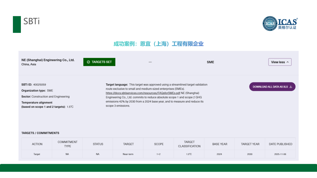中小企业:某综合工程公司委托ICAS英格尔认证完成SBTi承诺,以2024年为基准年设定2030年减排42%目标,因员工不足250人,无需强制设定范围三目标,通过设备升级、绿电采购推进减排;